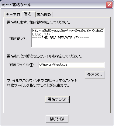 Note: 本来は、その「公開鍵」が公開される際に、その「公開鍵」が正当な物かどうかを確認させる必要があります。公開鍵がそもそも正当なものかどうかが分からなければ、電子署名の意味は薄くなります。しかし、吉里吉里のキー・署名ツールではそこまでの考慮は行っていません。